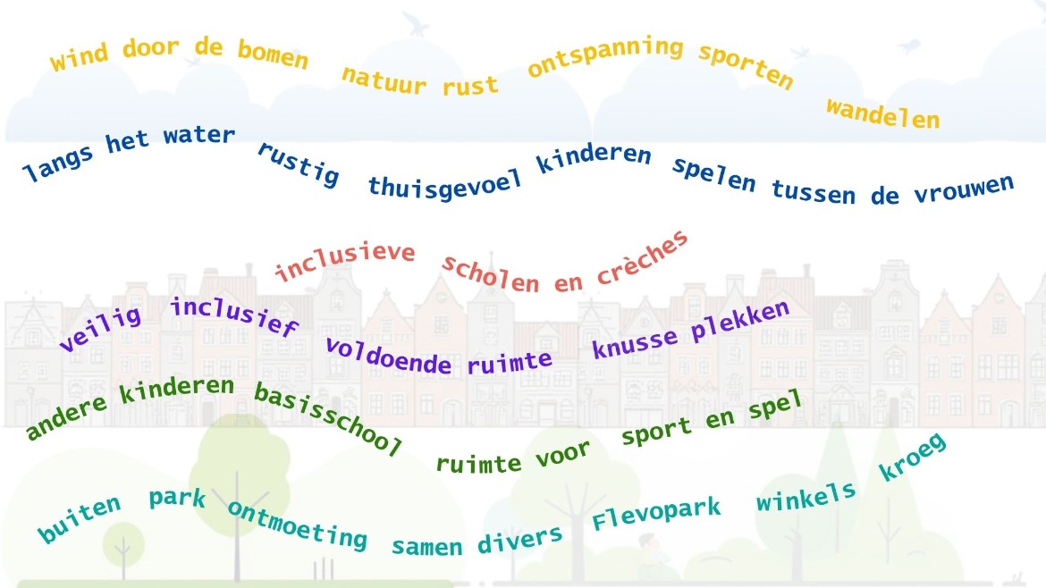 Voor een deel van de deelnemers is groen en een gevoel van natuur en ruimte belangrijk. Het Flevopark wordt daarbij veel genoemd en erg gewaardeerd.